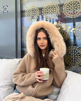 Detach the fur collar and machine wash the cardigan on a gentle cycle with cold water. Lay it flat to dry. For the fur collar, spot clean or follow the included care instructions.